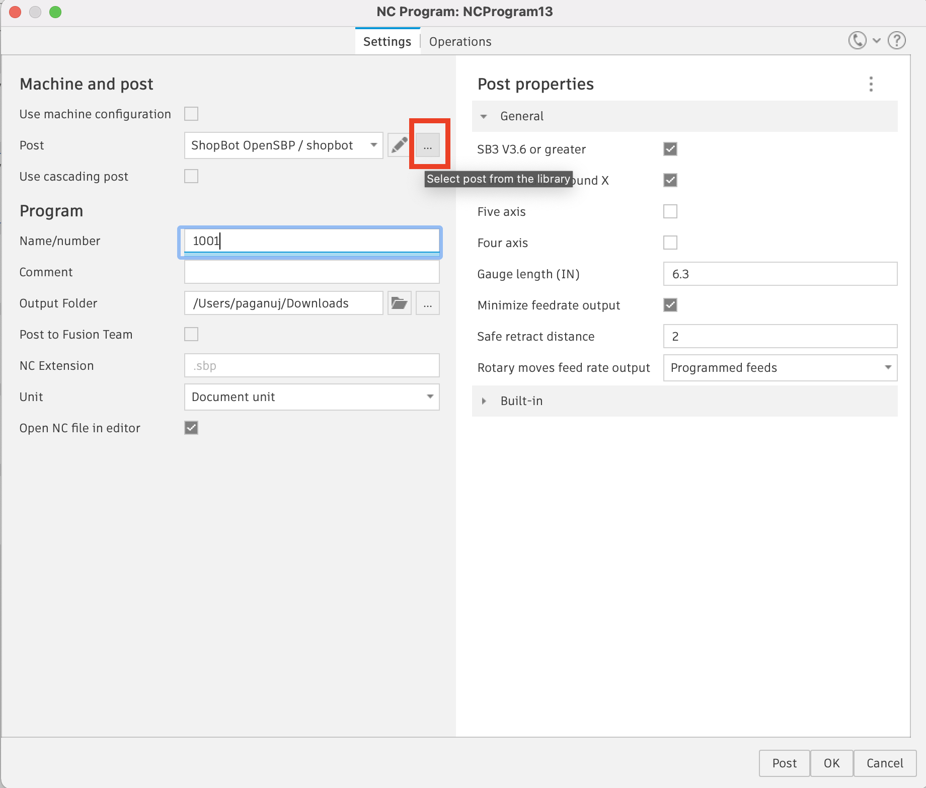 IMPORTANT You Must make sure that it is point to the same post that the default fusion360 post setup is pointed to or it will generate a error like seen here https://github.com/TimPaterson/Fusion360-Batch-Post/issues/34